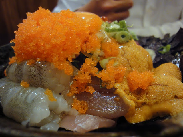 海鮮蓋飯背面,看的到超棒的蝦肉跟黃澄澄的海膽!!不敢吃海膽的朋友也適合的一品